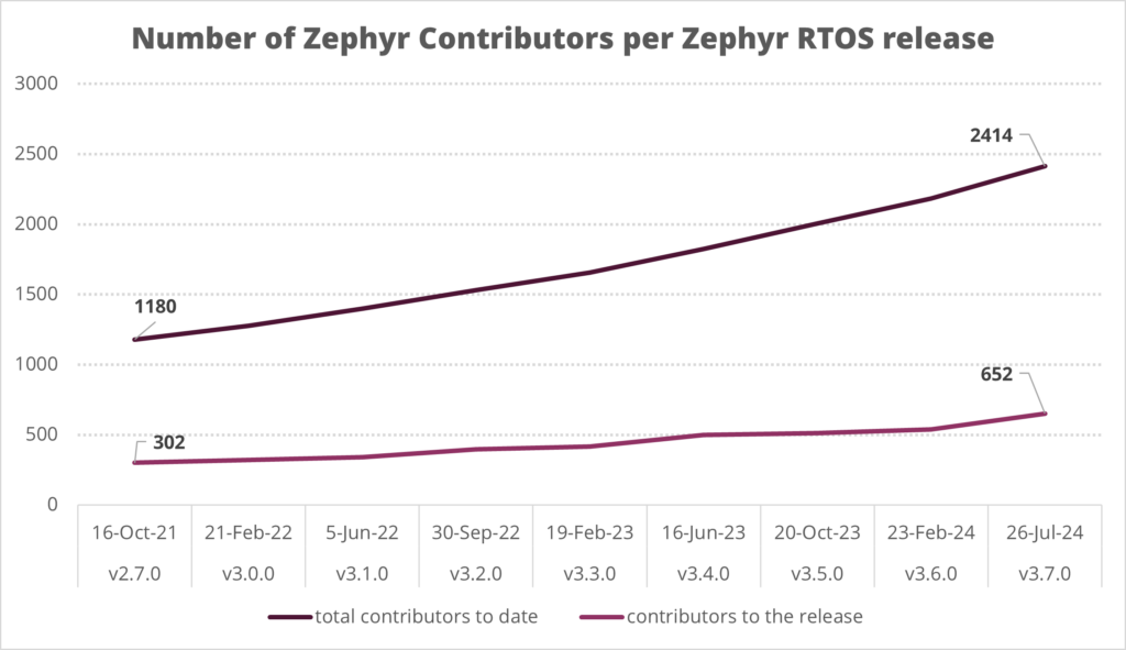 • Over 650 unique individuals contributed (new features, bug fixes, documentation, …) to the main GitHub repository of Zephyr for this release alone.