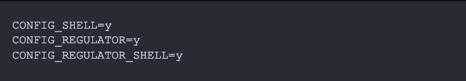 The regulator-boot-on property tells the regulator driver that the OS should turn on the regulator at boot (but shouldn’t prevent it from being turned off later). We just needed to set the following Kconfig symbol to enable the regulator drivers: