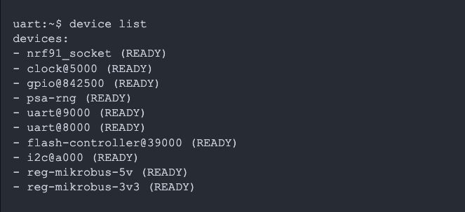 First, we need to get the device node for the regulator. You can list the available devices and their states using the device list shell command: