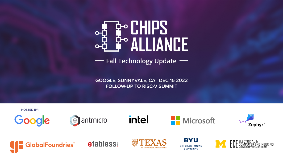 Join CHIPS Alliance on December 15 for an in-person Fall Technology Update featuring informative, technical talks on open source hardware collaborative development, hosted by Google and including speakers from Microsoft, Google, Intel, Antmicro, Efabless, the Zephyr Project and others.