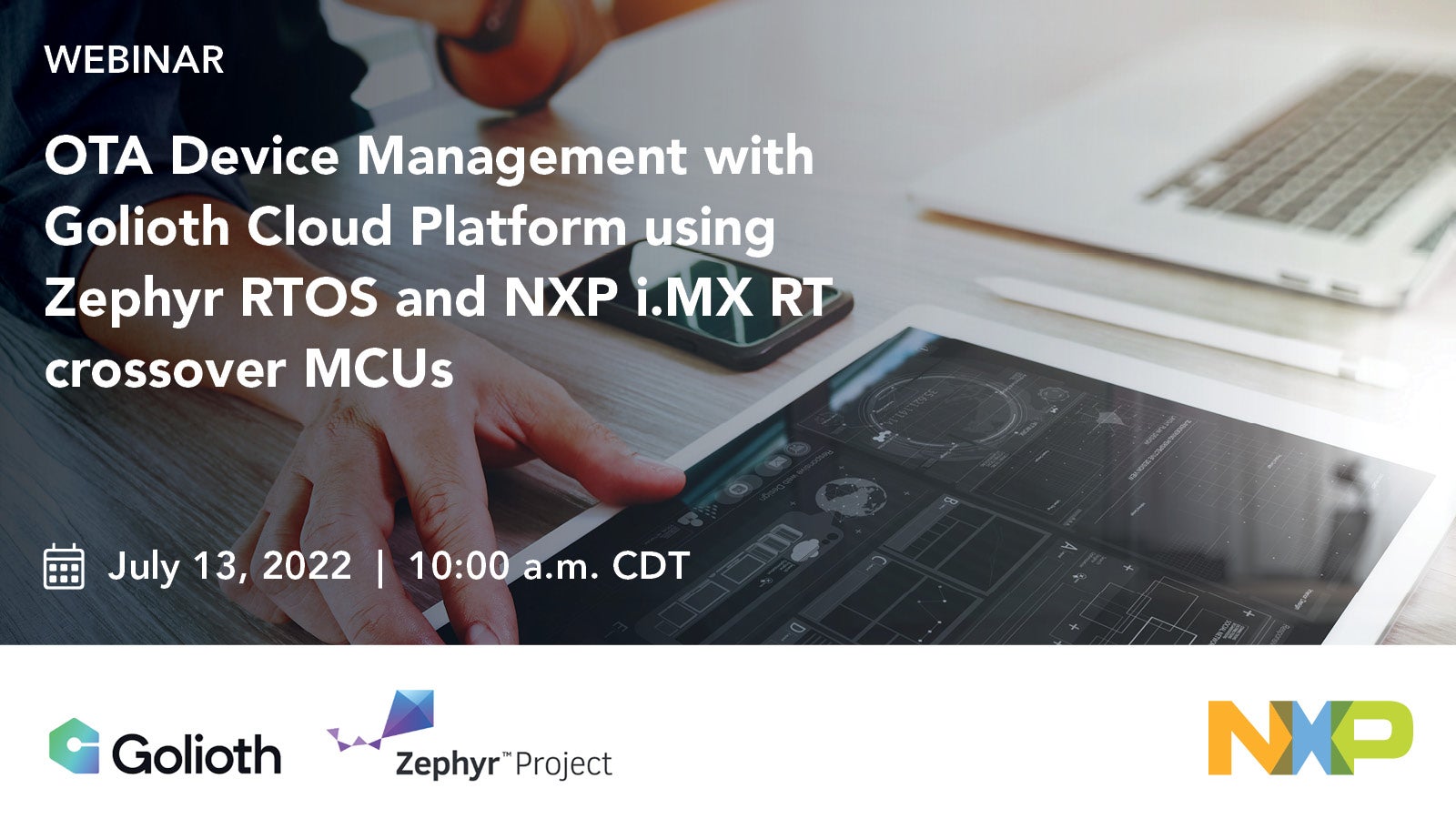 In this webinar on July 13 at 8-9 am PT, NXP and Golioth will uncover how to start from a development platform and quickly program that device to send data back to the Cloud. After creating a firmware build for i.MX RT10xx evaluation platforms in Zephyr, we will show how to use Golioth to implement a range of useful troubleshooting and data capture techniques. Join us as we explore how you can use NXP platforms to prototype intelligent products and quickly create IoT systems that can scale to thousands or millions of devices.