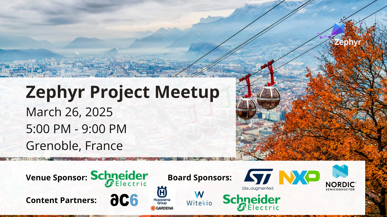 Are you passionate about open source, embedded systems programming, and software development? Join us for the Zephyr Project Meetup in Grenoble, France, on March 26, 2025, from 5:00 PM to 9:00 PM at Schneider Electric’s IntenCity.