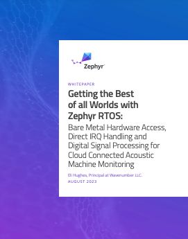 This new whitepaper titled, “Getting the Best of all Worlds with Zephyr RTOS: Bare Metal Hardware Access, Direct IRQ Handling and Digital Signal Processing for Cloud Connected Acoustic Machine Monitoring,” illustrates a cloud connected sensor application that combines high-performance acoustic sensing, DSP / edge processing, low power battery operation and secure cloud connectivity. Using Zephyr does not mean you have to give up any of the advantages of “bare metal” for high performance applications. In fact, you can get the best of all worlds while having a development framework that scales across projects.