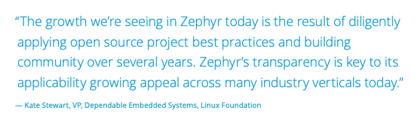 Zephyr is a great example for how industries can learn from each other, apply best practices, and achieve success with open source. For example, Zephyr now includes three software bills of materials included by default in each build, Zephyr ranked fifth in the 2023 Project Velocity Report from CNCF. This refers to the rate at which development tasks are completed and features are delivered in a specific amount of time.