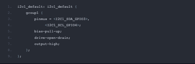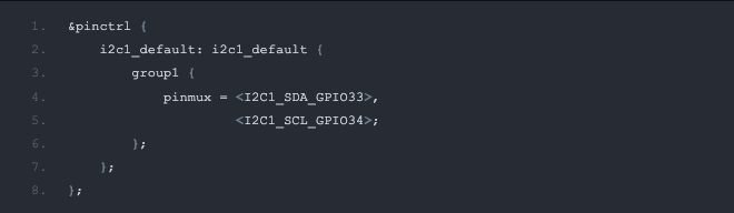 This pinctrl node uses a nodelabel of i2c1_default which is associated with the i2c1 peripheral in the board’s .dts file: