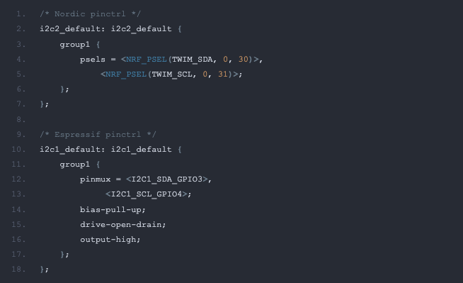 Vendors have documented their pinctrl implementation in their device bindings pages. Head over to the Zephyr bindings index and look for the pinctrl entry for your vendor. Espressif’s entry points to a set of macro definitions that lay out every possible function for each pin. Nordic’s entry indicates that rather than define each pin, we can use a macro to call out the nRF pin function along with the port and pin assignments.