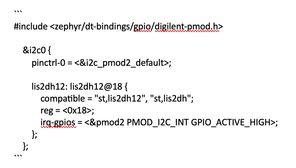 Pending getting merged upstream, you can find a West module containing the Zephyr board files here. Thanks to a recently merged PR, combining Pmod and Zephyr is extremely smooth, as we will show below.