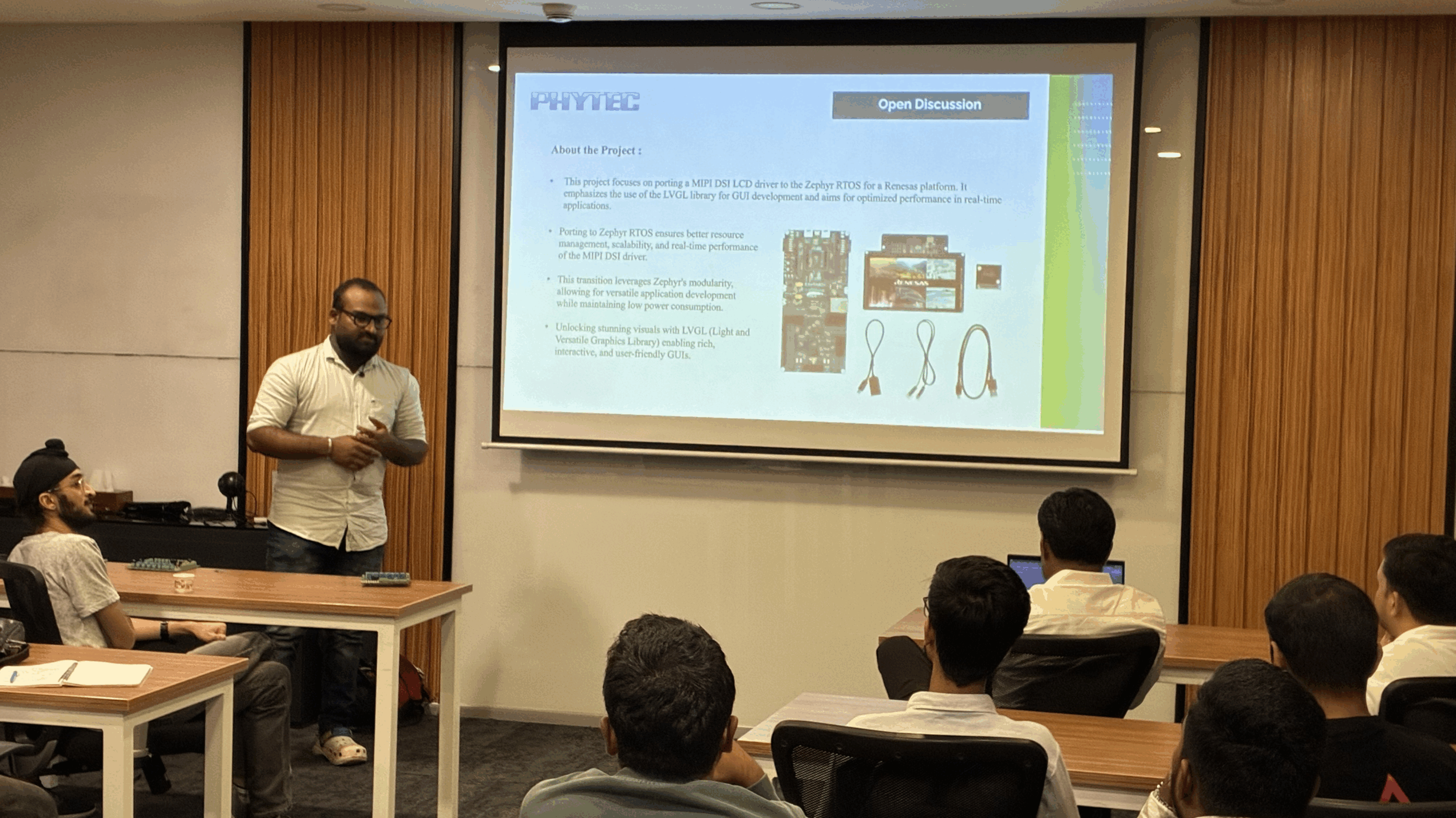 Vagesh Panditharadhya, Embedded Software Engineer, PHYTEC Embedded Pvt Ltd delivered a live demo showcasing HMI solutions using Zephyr and LVGL on the OpenSource RuggedBOARD-RA8 Renesas MCU. Slides here.