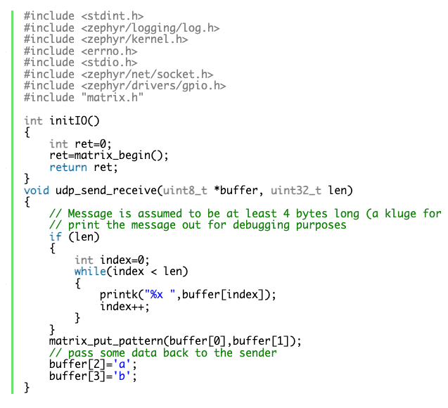 The function initIO configures I/O devices (the LED matrix in this case – see matrix.c in the github link provided below). The function udp_send_receive is called when a UDP packet is received. In this primitive example, the first two bytes are treated as row and column bit masks for the LED matrix. The values are passed on to matrix_put_pattern. Just before returning, two characters are placed in the return packet just to verify that communications is bidirectional.