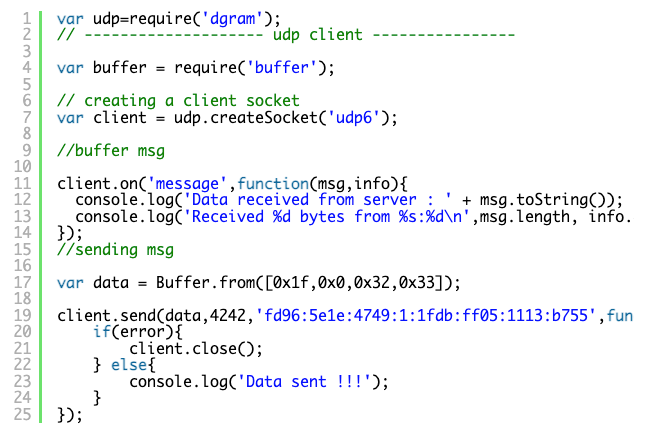 The IPv6 address of the Microbit has been hard-coded for now (working on network discovery next). The payload received by the Microbit is prepared in the data Buffer object. The first byte selects which rows are to be activated in the LED matrix (there are 5 of them). The second byte is selects which columns are active. In the case of columns, a ‘0’ in a particular bit activates that column.