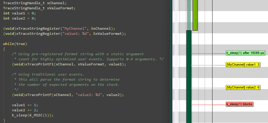 You may also use TraceRecorder to log additional user-defined events (“user events”) by calling the TraceRecorder API. This lets you visualize kernel events and application events together. User event logging is very fast and often a superior alternative to printf logging.