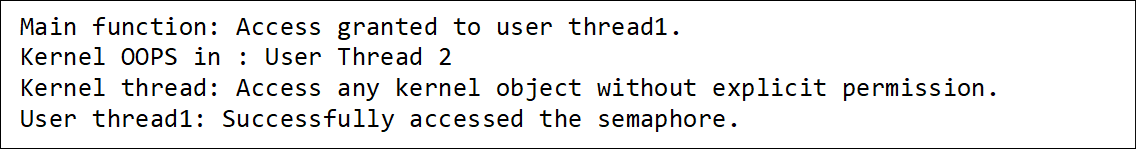 This example code sets up three threads to interact with a shared semaphore. The first user thread has permission to access the semaphore and does so successfully. The second user thread lacks permission and its attempt to access the semaphore leads to a system error, specifically reported as “OOPS” because of its unauthorized access. However, this error doesn’t stop other threads from running: the first user thread accesses the semaphore as allowed, and the kernel thread operates normally, showcasing that the system effectively isolates faults and continues operation despite errors in one thread.
