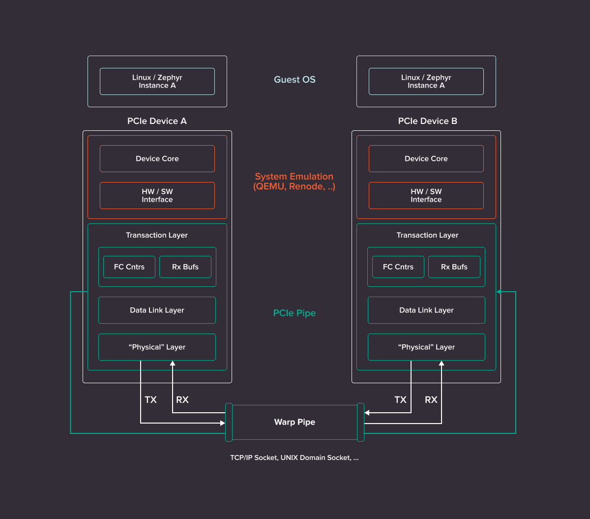 The Warp Pipe library is a Swiss Army knife for developing PCIe-based systems with numerous use cases, including the ability to work directly with host applications by mocking PCIe devices. The library enables node-to-node communication between two operating systems, creating PCIe links between instances of different simulators/emulators such as Renode or QEMU, running operating systems such as Zephyr or Linux while also handling Message Signaled Interrupts (MSIs), packet routing and flow control, with Warp Pipe taking care of communication between the instances. The structure of a typical Warp Pipe flow can be seen below:
