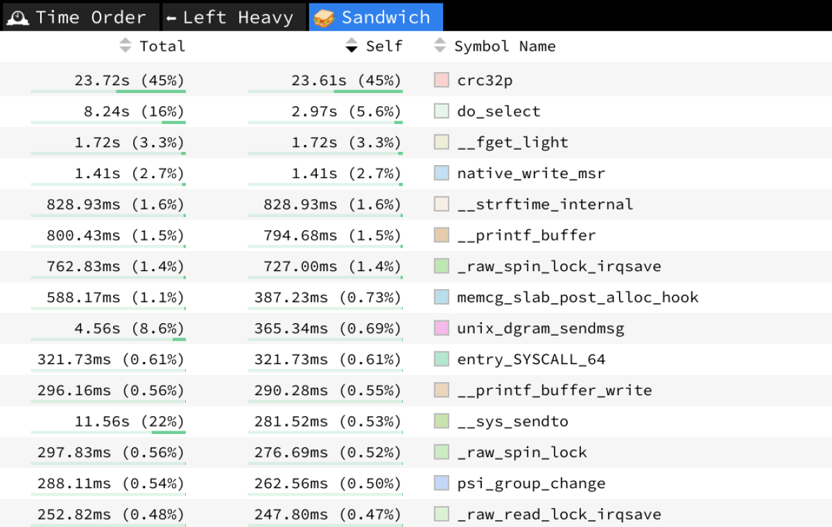 Warp Pipe can also be used for the purpose of verifying performance, as shown in the graphic below which illustrates a typical initial bottleneck analysis through the “Sandwich” view, suggesting CRC32 as a potential target for optimization.
