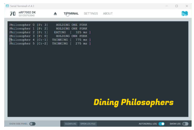 With my nRF7002DK board, I merged the source code of 2 apps (Dining Philosophers & GPIO button) to demonstrate the Dining Philosophers problem (a classic multi-thread synchronization problem) with multiple preemptible and cooperative threads of differing priorities, as well as dynamic mutexes and thread sleeping. Here are the 4 transitional states of 6 philosophers with 6 forks: THINKING, HOLDING ONE FORK, STARVING, EATING: