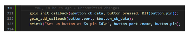 - Next is a key step of this demo. Initialize and add the callback handler function button_pressed(), which will be called when an interrupt is triggered: