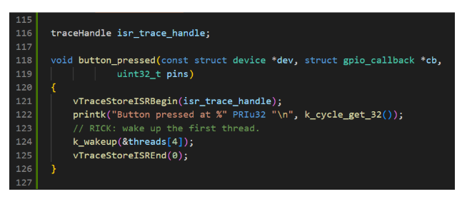 - The lines below define my ISR button_pressed(). At line 124, I purposely let the ISR wake up Philosopher #4, which has priority -1. While we are here, you will see I added 2 more lines (121 & 125) to enable tracing inside an ISR at the beginning and at the end. We will come back to this in detail in the next section when we configure Tracealyzer for tracing.