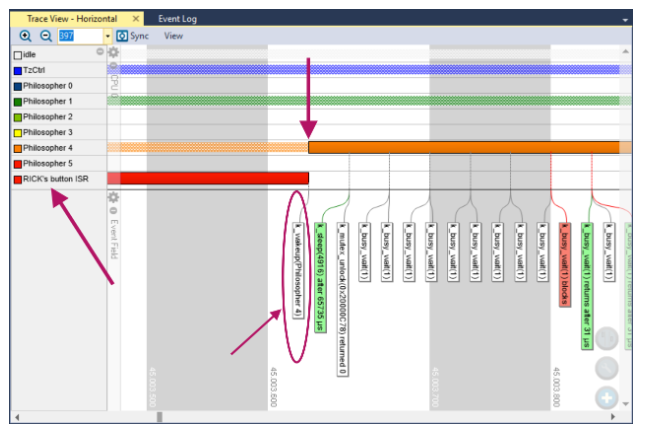 - The blue arrow shows the end of ISR, the execution returns back to “Philosopher 5”. Not like the previous traces showing “Philosopher 4” was scheduled to run at the end of ISR.