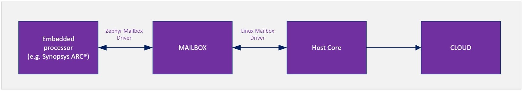 The encrypted data traverses the path from the ARC core to the host processor; the host processor runs a Linux distribution in the reference design using a dedicated hardware mailbox implementation to ensure secure data transition and provide integrity of information exchange in the system. This communication uses the concept of a Mailbox, supported both in Linux [6] and Zephyr [7], and is achieved using dedicated mailbox drivers and device tree entry on both operating systems.