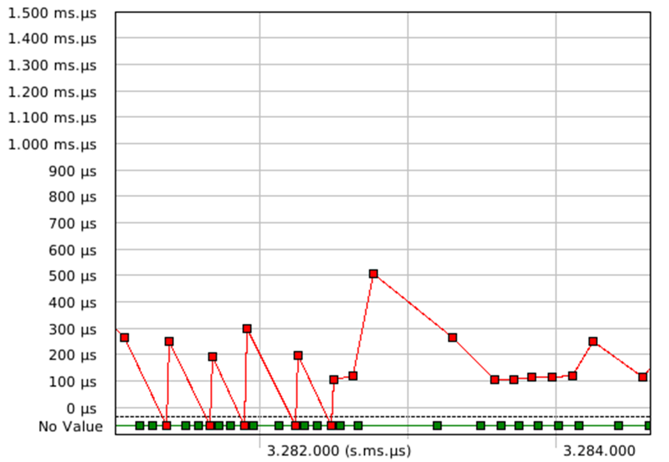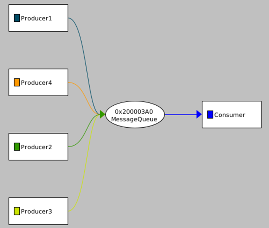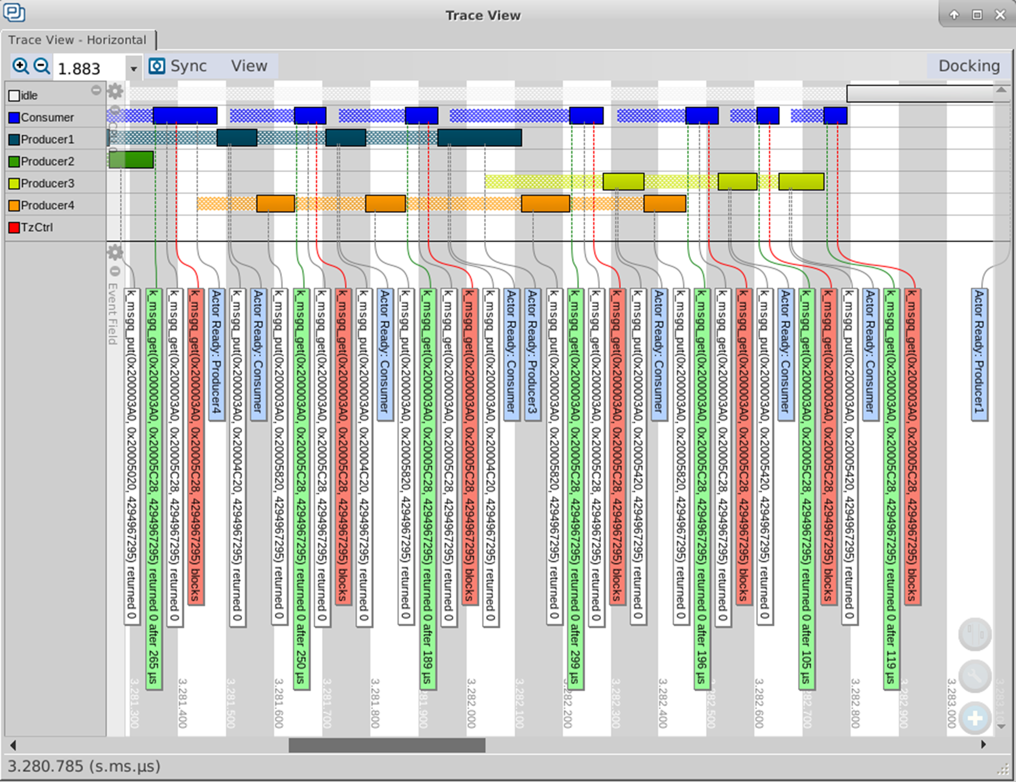 In the figure 2, we can see the communication flow to/from the message queue, in the figure 3 we can see the time spent by a thread in the blocked state waiting for the event, red dot is for the “k_msgq_get” called by the consumer and the green is for the “k_msgq_put” called by the different producers. We can notice that it has never been blocked on the “put” operation which means that producers have never attempted to put into a full message queue in this trace.
