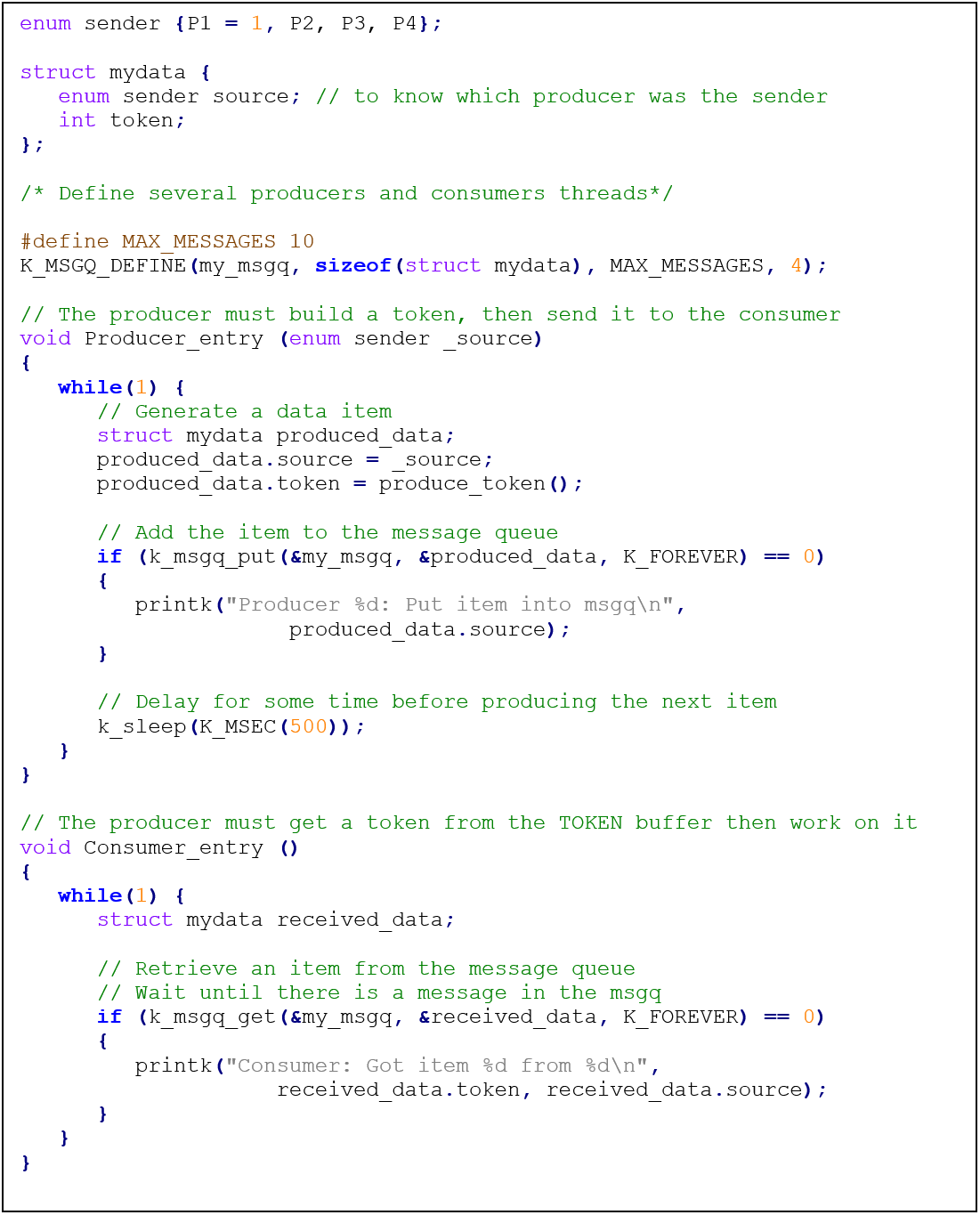 The “Producer_entry” thread is responsible for generating data items “produced_data” and adding them to the message queue using “k_msgq_put”. The producer specifies its source (using the “_source” argument) and generates a token with “produce_token”.