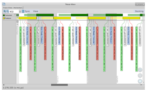 For example, when discussing the producer-consumer problem, Tracealyzer can be used to visualize the execution of the producer and consumer threads and how they interact with the shared buffer. As seen in the figure, the consumer (in green) executes after the semaphore was given by the producer (in yellow). This information can be useful in understanding the behavior of the system, identifying problems with synchronization, and finding solutions.