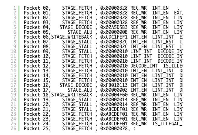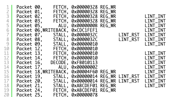 | 12345678910 | [22:54:19.6133781]Trace Packet, 00000054, 0xC3 40 , OPCODE_BRANCH , STAGE_FETCH , 0x000008EC INT_EN , :[22:54:19.6143787]Trace Packet, 00000055, 0xD1 40 , OPCODE_BRANCH , STAGE_DECODE , 0x04C12083 INT_EN , :[22:54:19.6153795]Trace Packet, 00000056, 0xE1 40 , OPCODE_LOAD , STAGE_ALU , 0x00000001 INT_EN , :[22:54:19.6163794]Trace Packet, 00000057, 0xF1 C0 , OPCODE_LOAD , STAGE_MEMORY , 0x0000476C REG_WR INT_EN , :[22:54:19.6183798]Trace Packet, 00000058, 0x01 C0 , OPCODE_LOAD , STAGE_MEMORY , 0x0000476C REG_WR INT_EN , :[22:54:19.6183798]Trace Packet, 00000059, 0x11 C0 , OPCODE_LOAD , STAGE_MEMORY , 0x0000476C REG_WR INT_EN , :[22:54:19.6193799]Trace Packet, 00000060, 0x20 C0 , OPCODE_LOAD , STAGE_MEMORY , 0x0000476C REG_WR INT_EN , :[22:54:19.6203802]Trace Packet, 00000061, 0x31 C0 , OPCODE_LOAD , STAGE_MEMORY , 0x0000476C REG_WR INT_EN , :[22:54:19.6213808]Trace Packet, 00000062, 0x43 C0 , OPCODE_LOAD , STAGE_MEMORY , 0x0000476C REG_WR INT_EN , :[22:54:19.6213808]Trace Packet, 00000063, 0x51 C0 , OPCODE_LOAD , STAGE_WRITEBACK , 0x00001CDC REG_WR INT_EN , : |