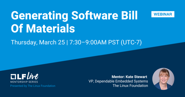 As part of the Linux Foundation, LF Live Mentorship Series, Kate Stewart, VP, Dependable Embedded Systems at The Linux Foundation, will present a webinar on Thursday, March 25 from 7:30-9 am PST titled, “Generating Software Bill of Materials.”