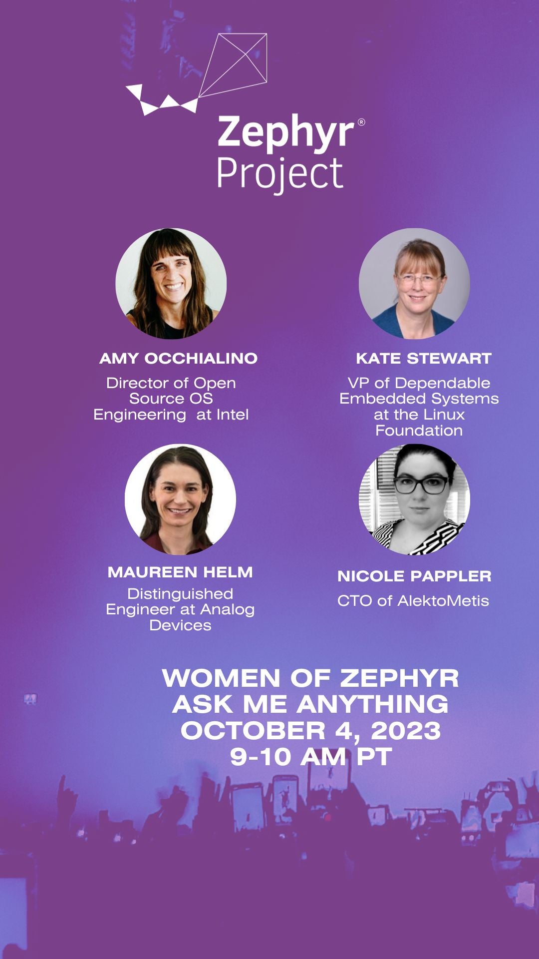 Join the Women of Zephyr on Wednesday, October 4 at 9-10 am PT to discuss the opportunities and challenges of working in technology, open source and more. Panelists will share their backgrounds, their roles within the Zephyr ecosystem and will answer any questions you have. Register here.
