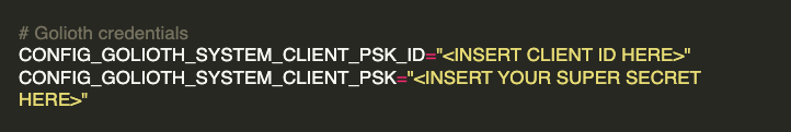 You will need to edit demo/golioth/config/golioth.conf with your credentials in order to connect to Golioth’s backend. Update CONFIG_GOLIOTH_SYSTEM_CLIENT_PSK_ID and CONFIG_GOLIOTH_SYSTEM_CLIENT_PSK with the credentials you used in the previous step.