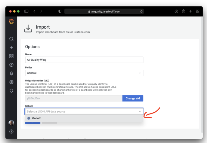 Then select the Golioth data source that we set up earlier and click Import