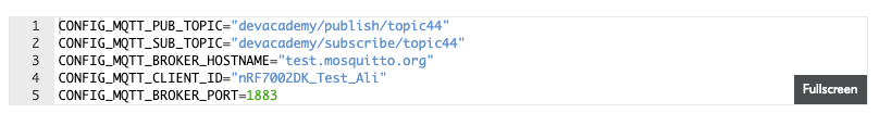 Remember that MQTT is a publish/subscribe protocol that allows multiple clients to connect to the same broker and potentially publish/subscribe to the same topics. Therefore, it is recommended to change the CONFIG_MQTT_SUB_TOPIC and CONFIG_MQTT_PUB_TOPIC to your preferred topics (ex: nRF7002DK/subscribe/mytopic389gsk3aX and nRF7002DK/publish/mytopic389gsk3aX) to try to avoid multiple users using the same topics.