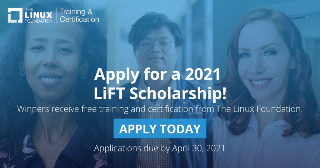 Linux Foundation Training (LiFT) Scholarships are back! Since 2011, The Linux Foundation has awarded over 600 scholarships for more than a million dollars in training and certification to deserving individuals around the world who would otherwise be unable to afford it. This is part of our mission to grow the open source community by lowering the barrier to entry and making quality training options accessible to those who want them.