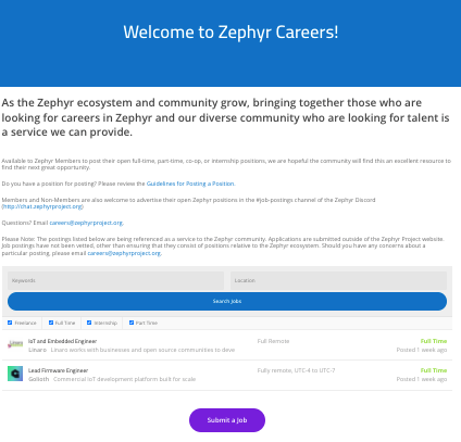 We are excited to announce the availability of the new Zephyr Career Resource, a job board that brings together those who are looking for careers in Zephyr and our global ecosystem looking for talent.