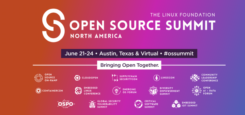 This year, Open Source Summit North America was held as an umbrella conference on June 21-24 in-person in Austin, Texas and virtually for attendees around the globe. It was composed of a collection of 14 events covering the most important technologies, topics, and issues affecting open source today. OSS NA gathered 2,771 total attendees with 1,286 of those attending in person in Austin, from 1,041 organizations across 68 countries.