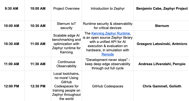 Zephyr members will be on-site to walk through the demos but also to give quick lightning talks at the booth. Here’s a snapshot of the schedule: