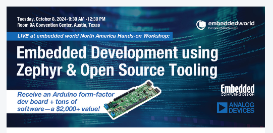 On Tuesday, October 8 at 9:30 am – 12:30 pm, we invite you to a Hands-on Workshop: Embedded Development using Zephyr & Open Source Tooling. This 3-hour hands-on workshop will introduce attendees to ADI’s solutions that address this complexity challenge, based on open-source tooling (GCC, GNU build tools), ecosystems (Zephyr, etc.), and config and debug tooling (VS Code, etc.). Attendees will receive a MAX32690-based development platform, which is yours to keep. This Arduino form-factor kit includes a HW debugger, and a high-performance MEMs accelerometer breakout to sample data from. Learn more and register here.