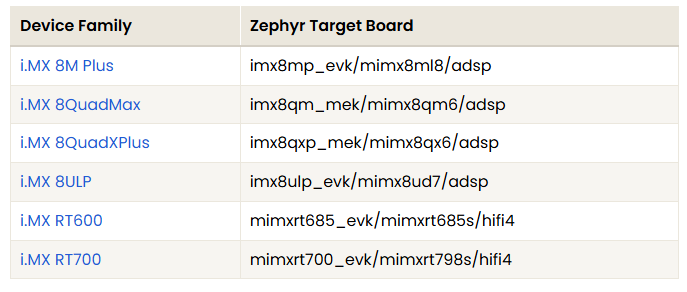 The same Zephyr build environment can be used for all of these targets, allowing a unified development workflow across ARM and DSP cores.