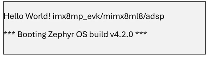 The standard Zephyr hello_world sample demonstrates successful boot and execution of Zephyr on the HiFi4 DSP. Once the firmware is built and loaded, the DSP console output confirms successful startup: