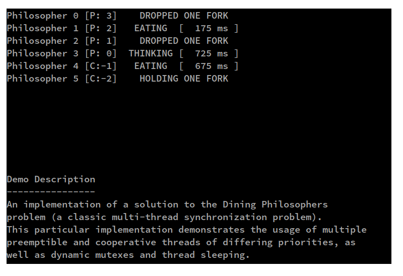 Zephyr comes with a number of demos you can run on the Mercury XU1 SoM, and we’ll focus on the philosophers demo here. It implements a solution to the Dining Philosophers problem, which in computer science is considered a classic multi-thread synchronization problem.